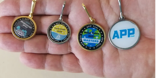 These 1/2 inch souvenir pins are sold in sets. One GOLD pin, one SILVER pin, and one BRONZE pin. The pins can be handed out to the players in conjunction with receiving their medals. The player can then put the pin on their tournament patch to show the medals they won at the tournament. Alternatively, the pins could be used in place of a typical medal. In this case, the tournament patch becomes the medal. Lanyards are also available for use in the medal ceremony.